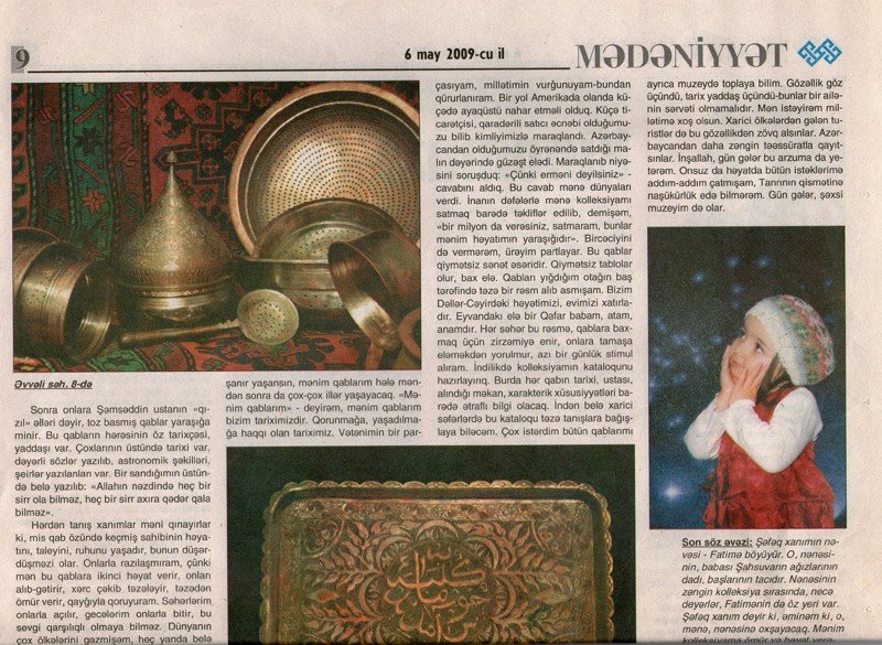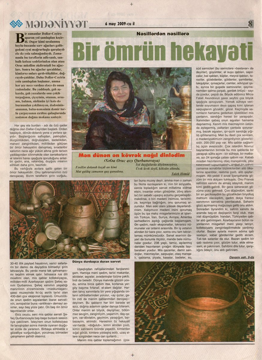 Azərbaycan Mədəniyyət və Turizm Nazirliyinin orqanı olan "Mədəniyyət" Şəfəq Qurbanovanın uzun illər ərzində topladığı Azərbaycan sənətkarlarının hazırladığı mis məmulatı kolleksiyası haqqında geniş material çap etmişdir.